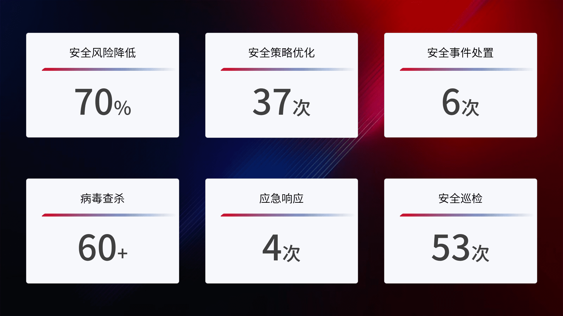 提供全面的安全事件报告体系,,,包括处置报告、、、周报、、、季度和年度总结,,,,结合持续监控,,,帮助客户深入了解网络安全状况。。